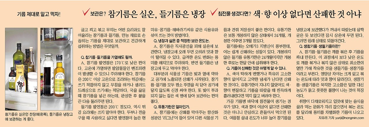 [3] 농민신문 - 기름 보관은? 참기름은 실온, 들기름은 냉장 (https://www.nongmin.com/article/20231124500393)